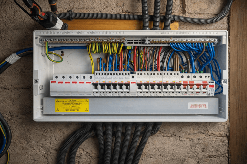 Consumer unit upgrades in London and surrounding areas, installing modern RCBO-protected consumer units fully compliant with BS 7671 to improve electrical safety and reliability.